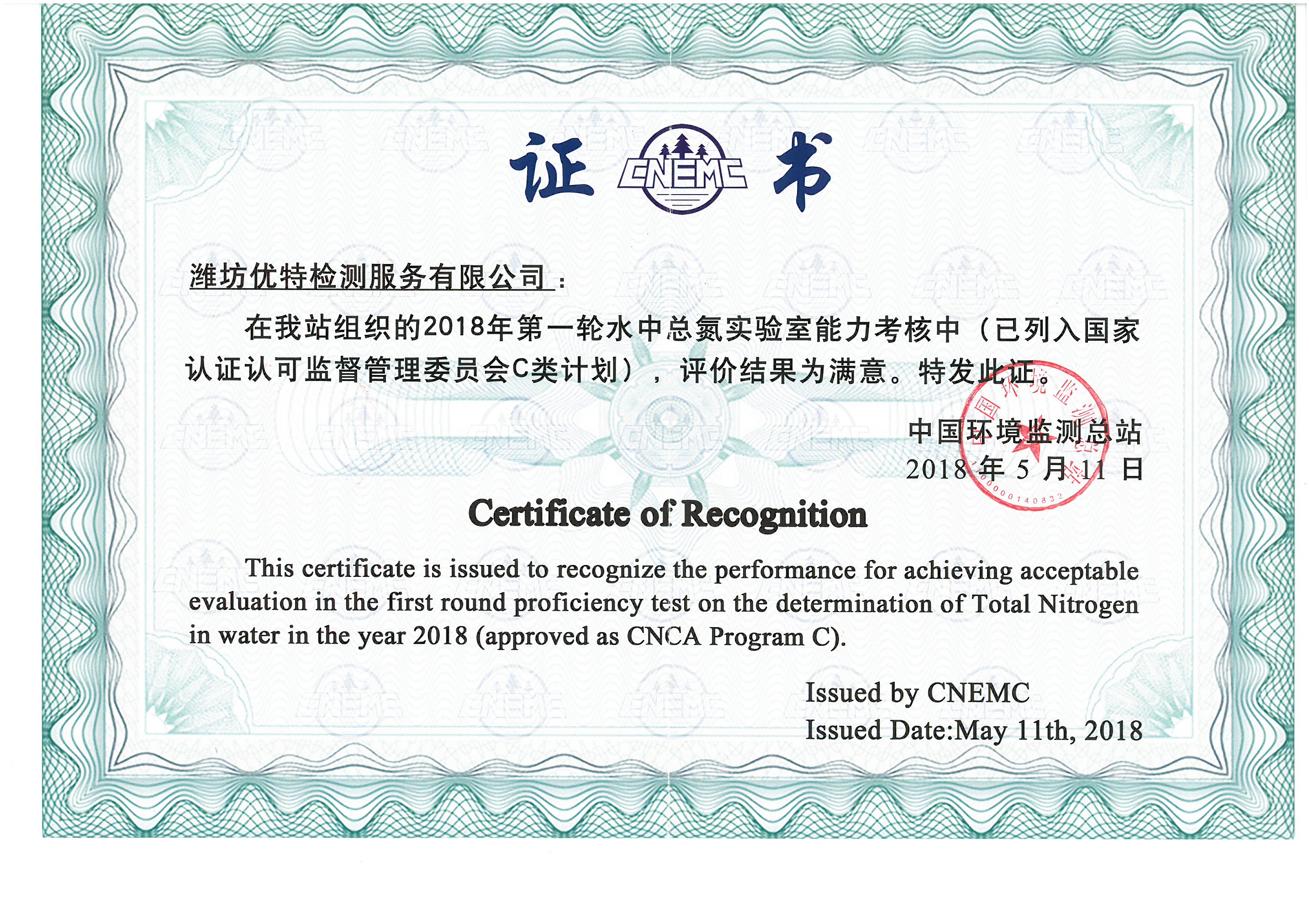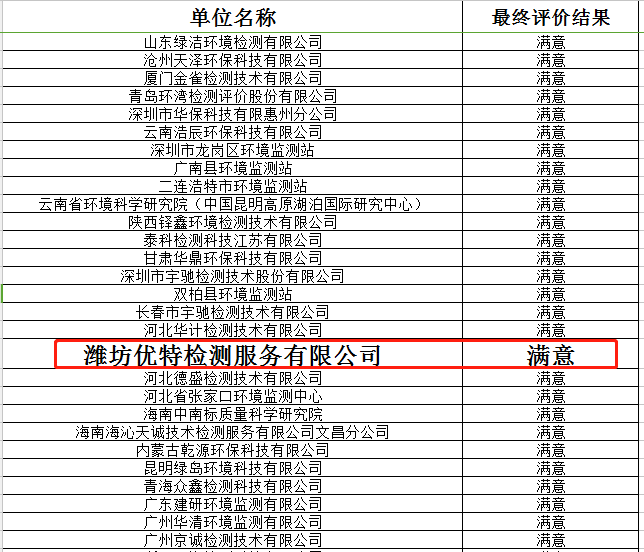 日前,由中国环境监测总站开展的2018年第一轮水中总氮实验室能力考核结果公布,能力考核结果为“满意”的企业名单中,潍坊鼎点娱乐检测服务有限公司赫然在列。